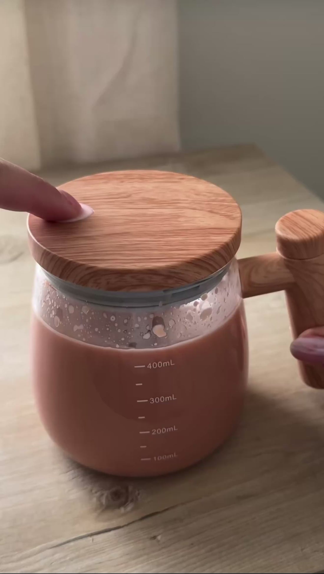 What is the design and material of the self-stirring mug?: The mug is crafted from durable glass with a handgrip for easy handling. It has a universal purpose, making it ideal for a variety of drinks. The American style design adds a modern aesthetic, making it a stylish choice for everyday use.